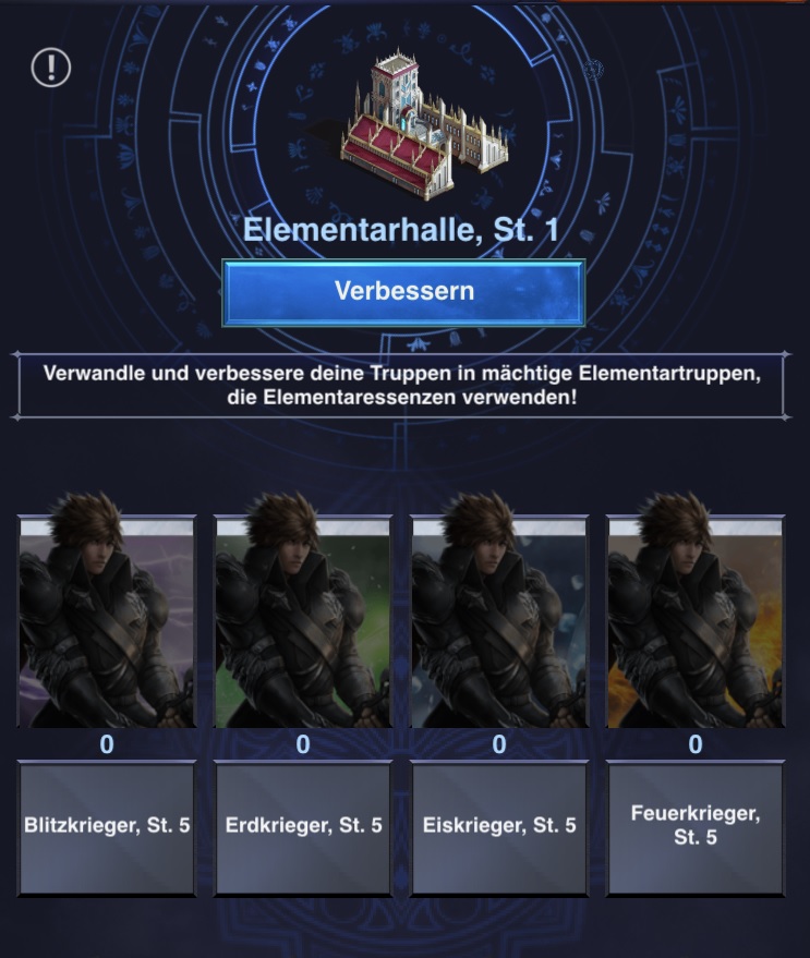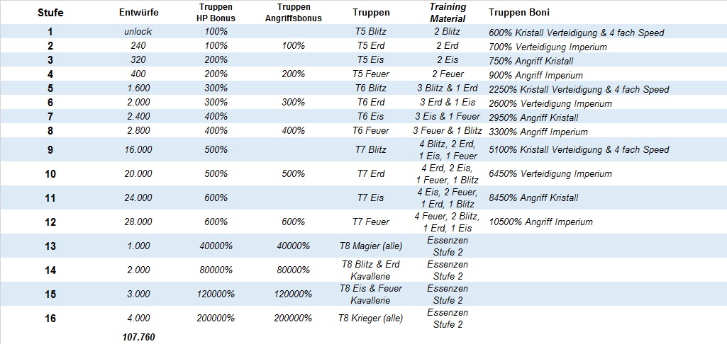 Je nach Stufe der Hallle, kann man dann unterschiedliche Stufen der Elementartruppen befördern. Dies beginnt mit Blitztruppen der Stufe 5 auf Level 1 der Halle, und endet mit Feuertruppen der Stufe 8 auf Level 16. Für den Ausbau, werden jeweils eine bestimme Anzahl an Entwürfen je Stufe benötigt.