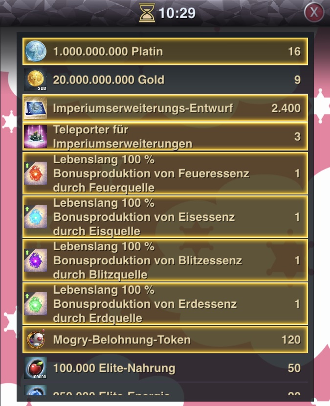 Dies gilt für alle Erweiterungen ! Des Weiteren haben die Astrale Shiva (Eis) und Ifrit (Feuer), sowie Iris Fertigkeiten um die Produktion nochmals der Quellen nochmals anzuheben. Alternativ wird immer mal wieder ein Paket angeboten, welches die Produktion der Quellen um 100% steigert.