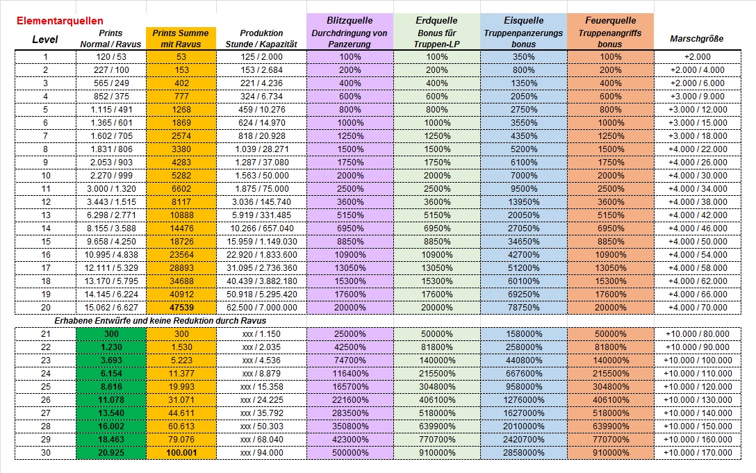Elementartruppen sind ungefähr eine Stufe stärker als die normalen Kerntruppen. Somit entsprechen T5 Elementartruppen dann T6 Kerntruppen, T6 Elementar = T7 Kerntruppen usw. Dabei hat jede Truppenart einen besonderen Boni, welchen man der Tabelle entnehmen kann.