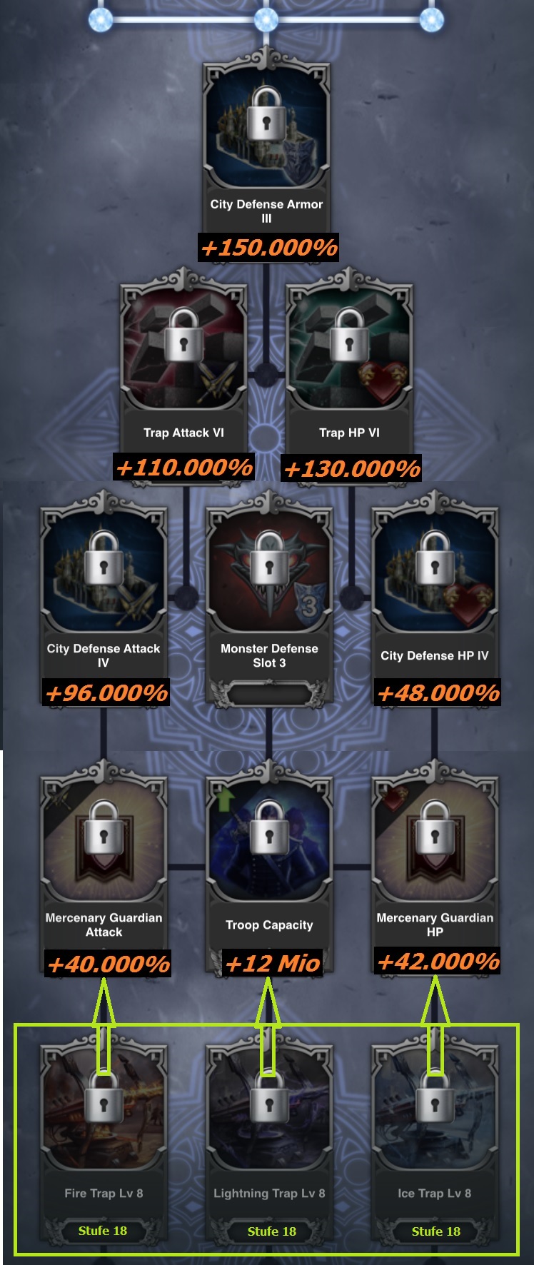 LP (84.700%) und Panzerung (216.700%) bei Stadtverteidigung, sowie Fallen LP