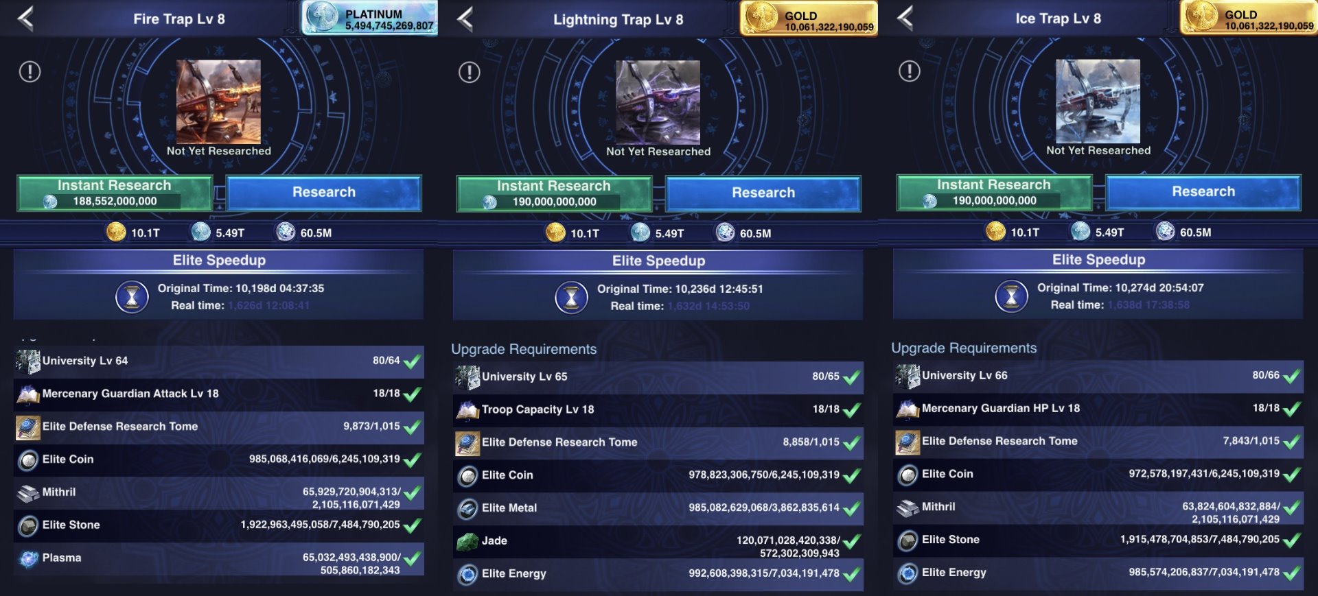 Um die Fallen erforschen zu können, muss die jeweils darüber liegende Fertigkeit auf Level 18 erforscht werden. Normalerweise mache ich ja immer eine Liste mit Ressourcen und Zeit, aber die Kosten sind so extrem, dass ich diesmal darauf verzichte. Jeder der mit den Forschungen anfängt wird dann verstehen warum. Hat man alles auf 18 gebracht, kann man die Fallen erforschen.