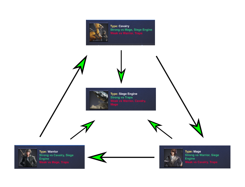 Dabei ist die Kavallerie die schnellste, und Belagerungsmaschinen die langsamste Truppenart. Wie in den Statistiken der Truppen zu erkennen ist hat jede Truppenart ein Pendant. Sprich jede Art ist gegen eine andere besonders effektiv bzw. anfällig. Lediglich Belagerungsmaschinen sind nur gegen Fallen geeignet. Dies ist wichtig zu verstehen, denn nur so kann man effektiv angreifen / verteidigen.