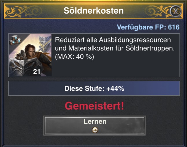 Was allerdings neu ist, dass man nun jede einzelne Truppenart zuerst in der eigens dafür geschaffenen Forschung freischalten muss. Ebenso können dort diverse Verbesserungen erforscht werden um dann die Söldner immer um eine Stufe zu verbessern. Sprich das ganze ist nun so aufgebaut wie die normale Truppenforschung. Ich hoffe, dass dadurch auch die Anzahl der Söldner gering bleibt.