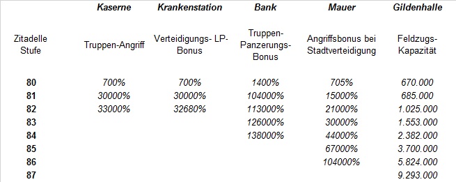 Als kleiner Anhaltspunkt einmal die Boni für Gebäude ab Stufe 80. Diese steigen ab dann extrem an.