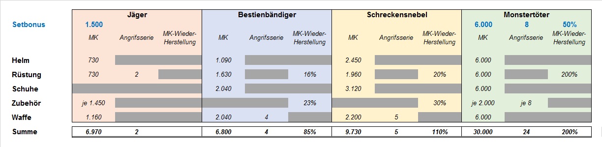 Dort gibt es wichtige Boni für Maximale MK und die Wiederherstellung.- Ein komplettes Jäger-Set gibt einen Set-Bonus für MK.