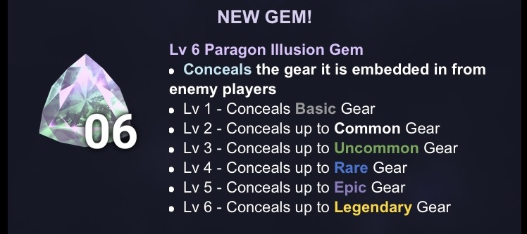 Diesen Edelstein kann man in einem Paragorn Platz einer Ausrüstung platzieren und damit diesen Gegenstand für den Gegner unsichtbar machen. Immer vorausgesetzt das die Stufe des Illusion Gems gleich oder besser der Ausrüstungsqualität ist.