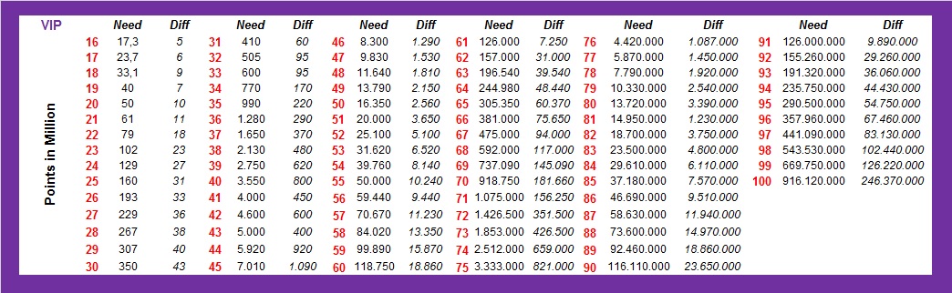 Zur Übersicht einmal die Punkte, welche für die einzelnen VIP-Stufen bis Level 100 benötigt werden.