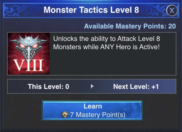 Im Gegensatz zu allen anderen Monsterstrategien, welche in der Universität in der Heldenforschung erforscht werden, ist die Monsterstrategie Stufe 8 eine Heldenfertigkeit von Noctis.