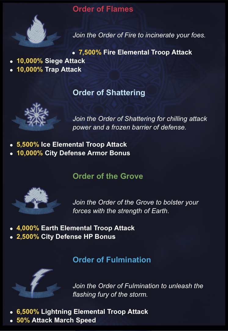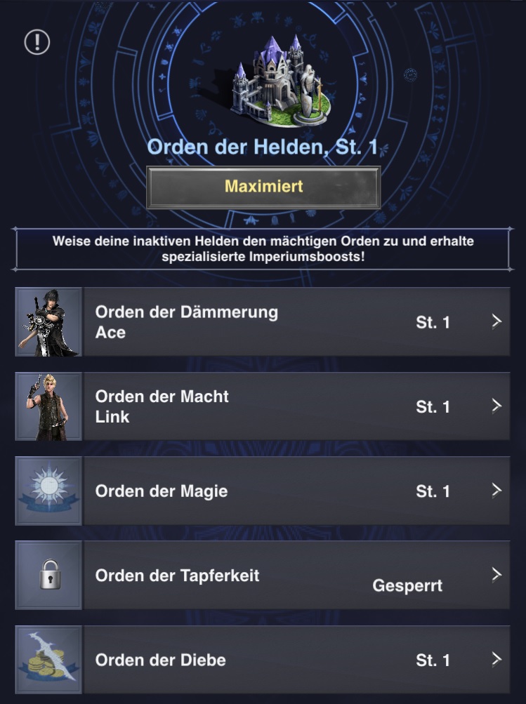 Dies ist somit eine nette Option, um den Helden einen Sinn zu geben, während ein Held aktiv ist. Dazu muss man sich lediglich den gewünschten Orden aussuchen, und einen Helden diesem zuweisen. Allerdings lädt ein Held keine MK, wenn er einem Orden zugewiesen ist.