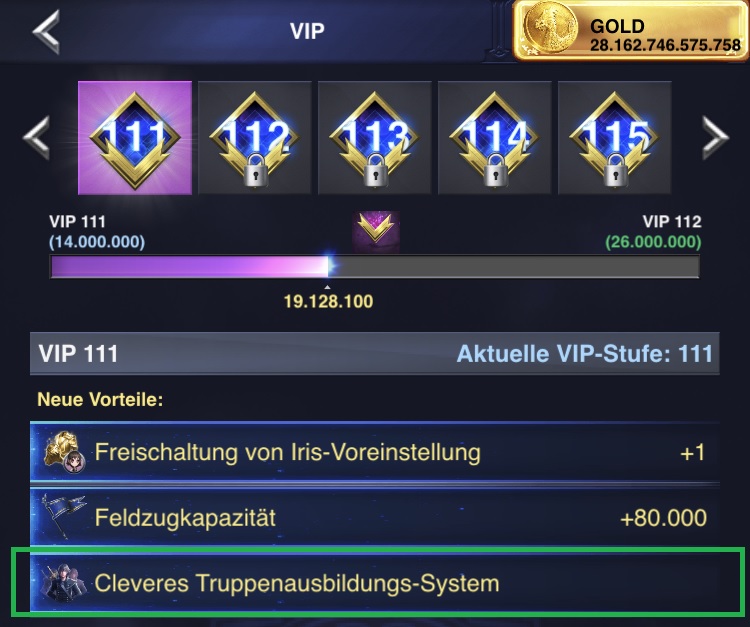 Und zwar mit dem erreichen von VIP 111 soll es einem die Ausbildung von Truppen ermöglichen. Es wird einem dadurch immer die maximal Anzahl an Truppen angezeigt, welche man mit den aktuellen Ressourcen ausbilden kann.